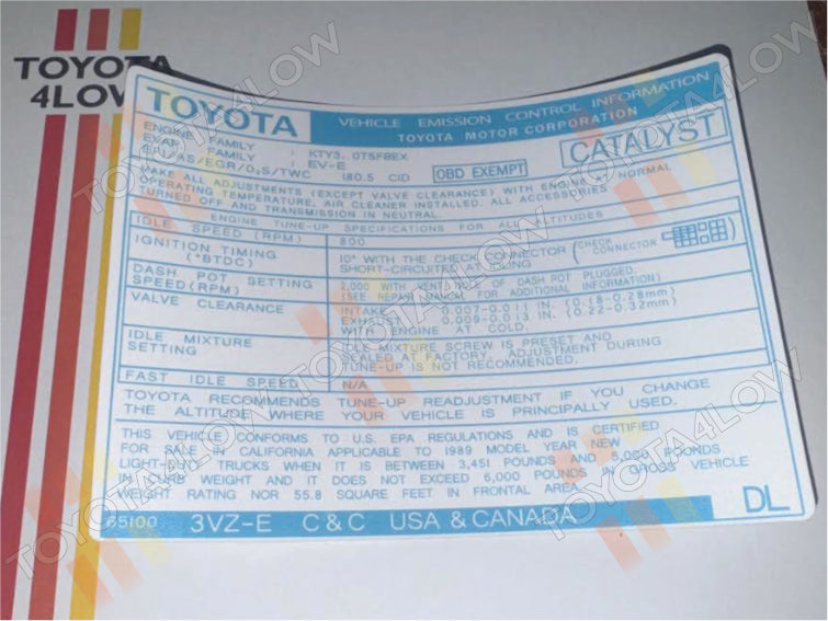 1989 Emission Decal - 3VZ-E USA & Canada C&C #DL