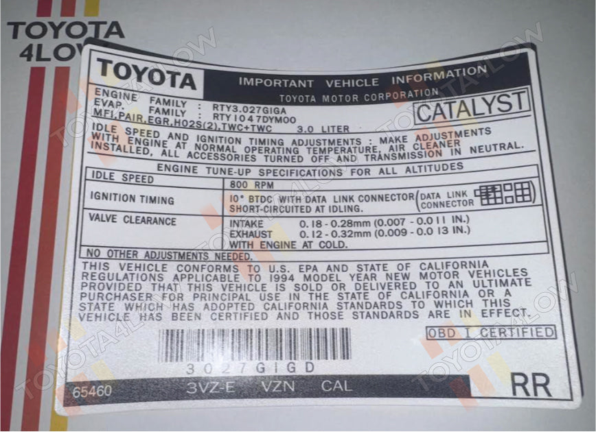 1994 Emission Decal - 3VZ-E USA & Canada #RR