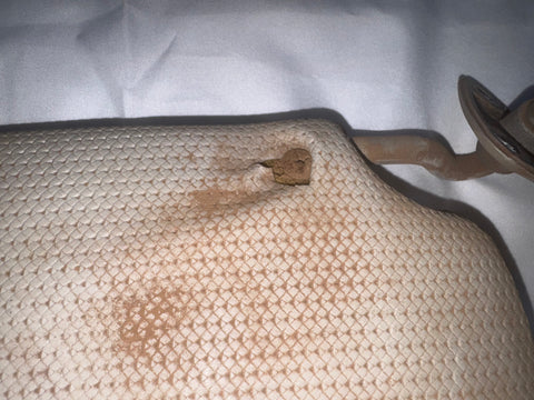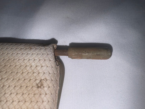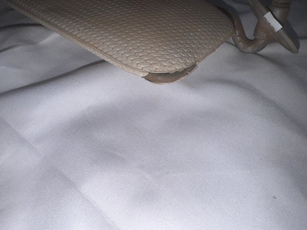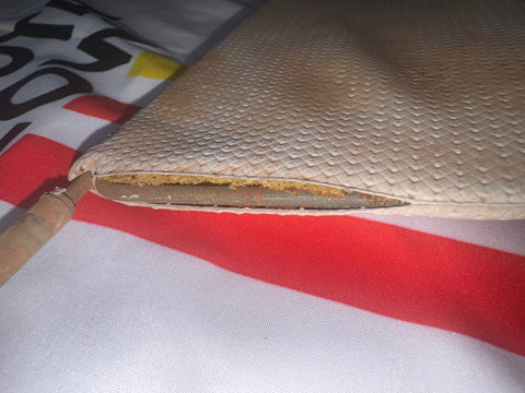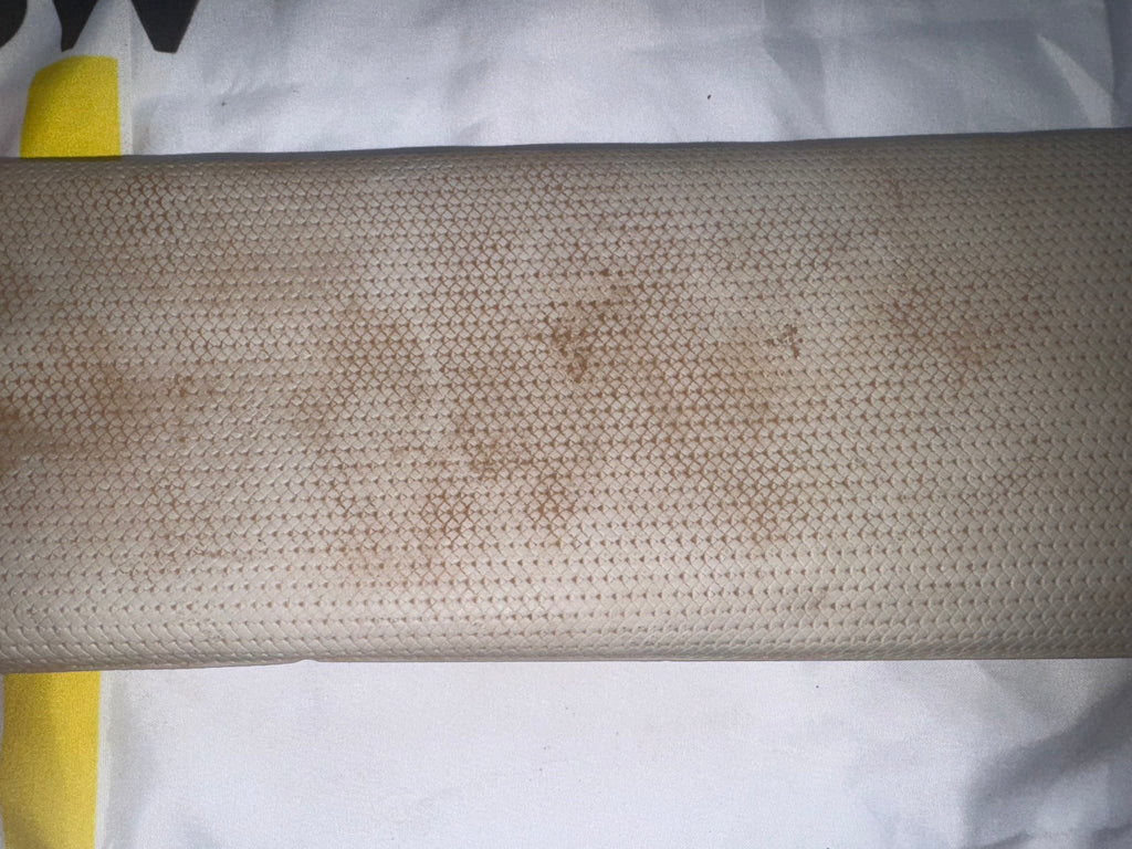 Dirty, needs a good cleaning. There are a couple tears in the vinyl; two along edge and one around the tension screw. Would be a good candidate for redoing.